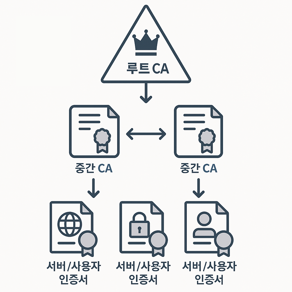 이처럼 루트 CA와 중간 CA들이 이루는 위계 구조를 인증서 체계 계층(Certificate Hierarchy) 또는 피라미드에 비유하기도 합니다.