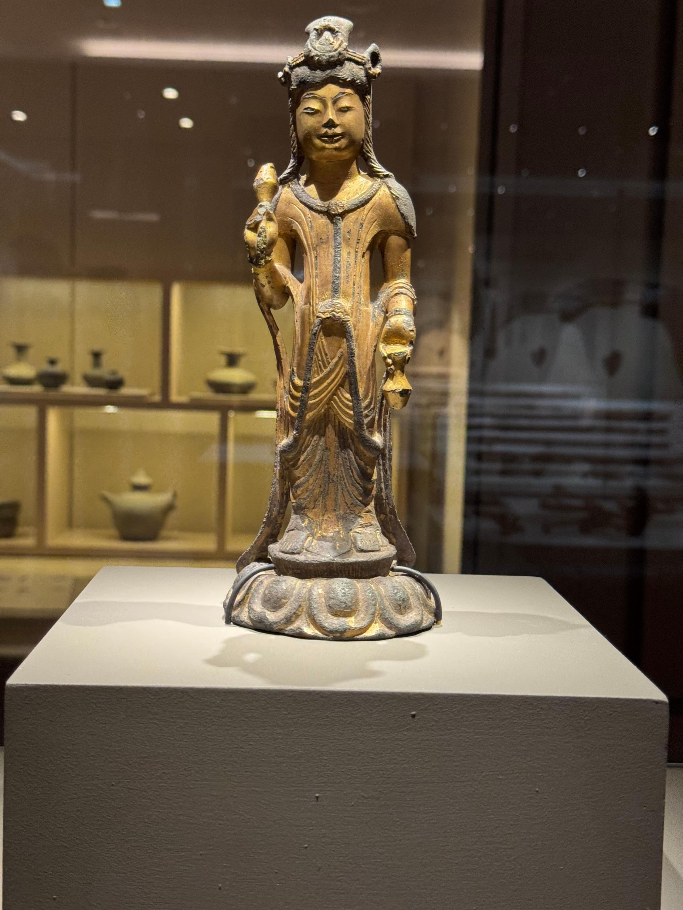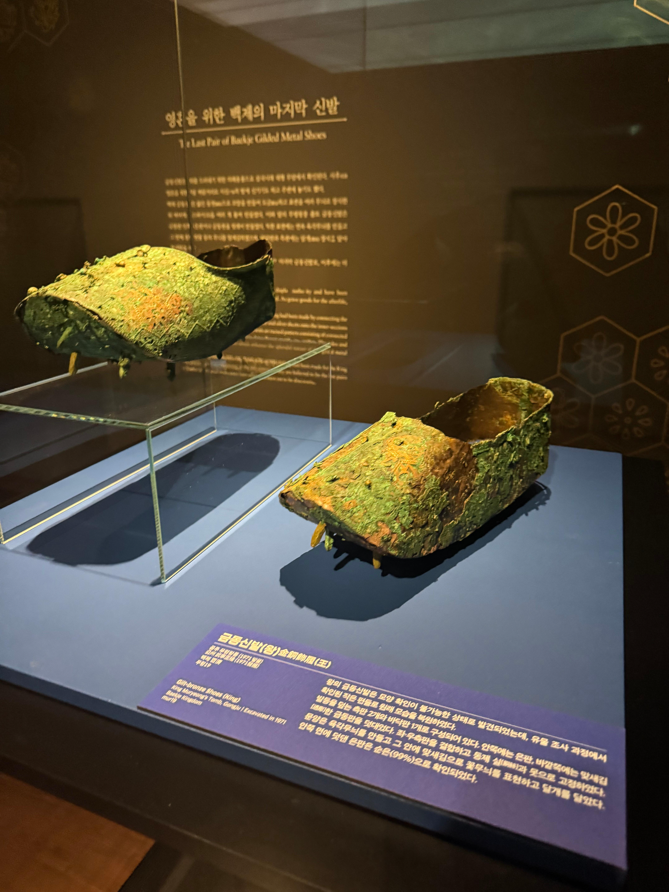 그 주변으로는 출토된 금귀걸이, 목걸이, 은팔찌 같은 장신구들과 오수전이라 불리는 청동전화폐, 무늬가 새겨진 청동 거울, 그리고 금동신발까지 다채로운 유물이 전시되어 있었습니다.