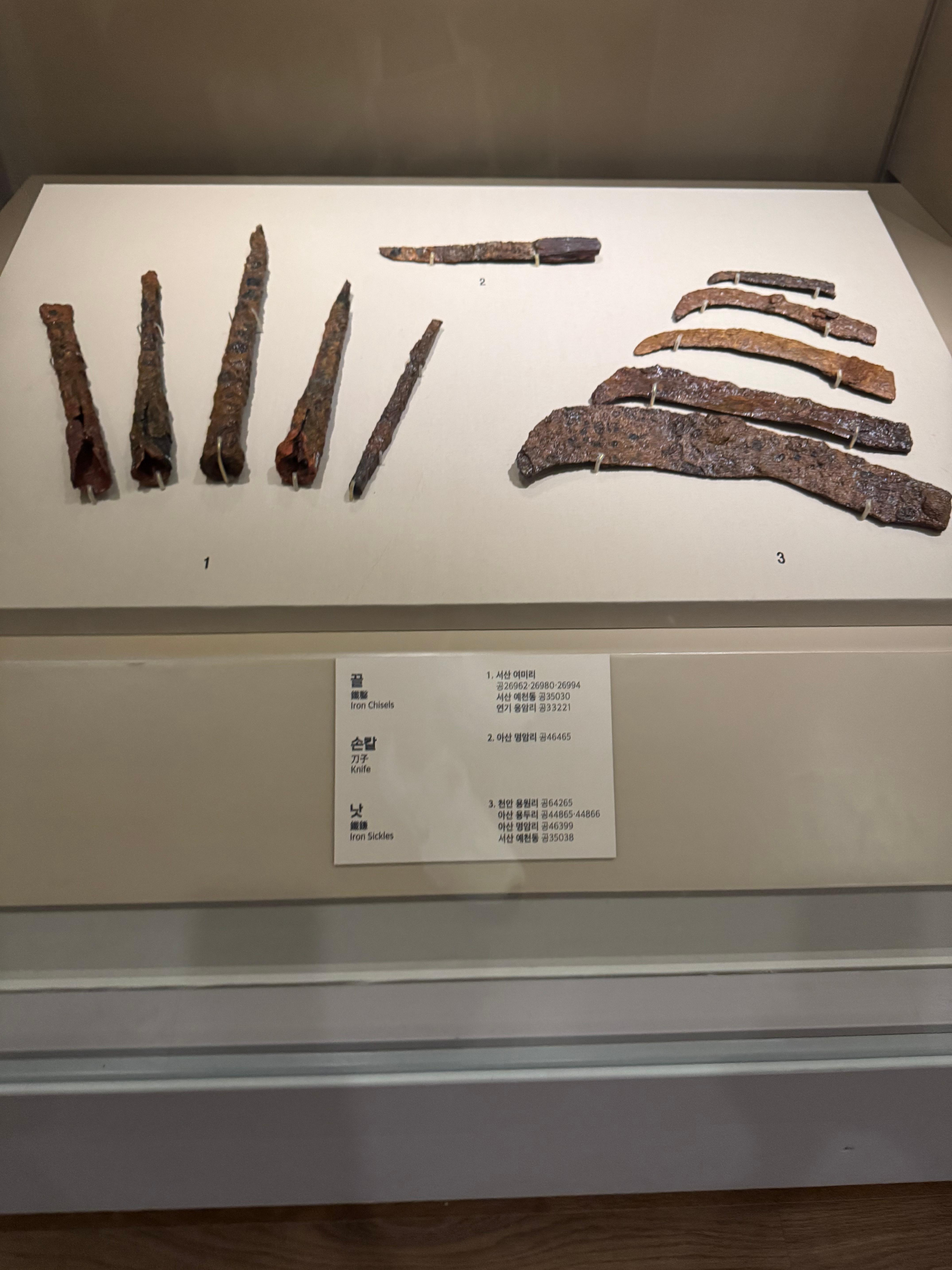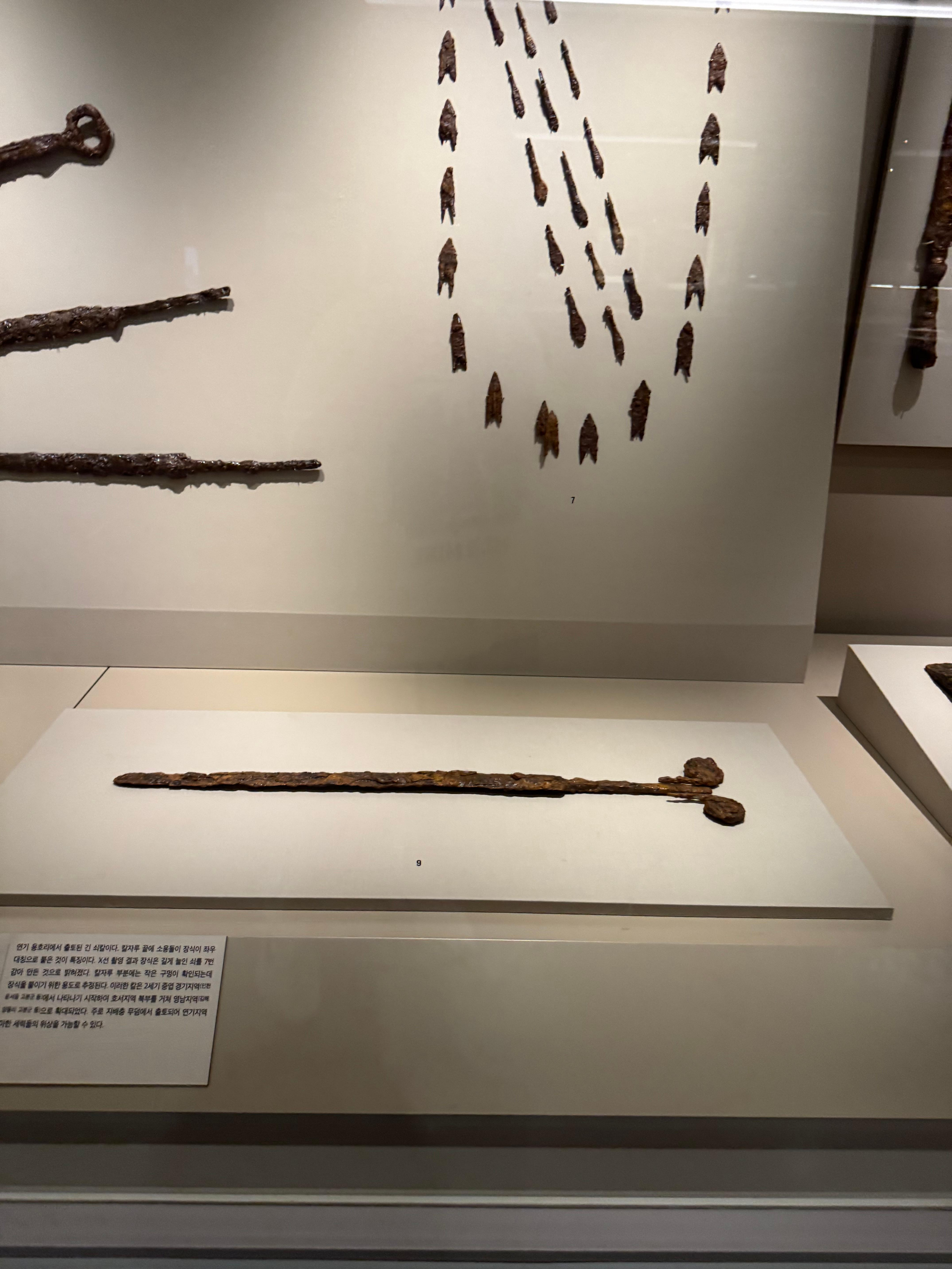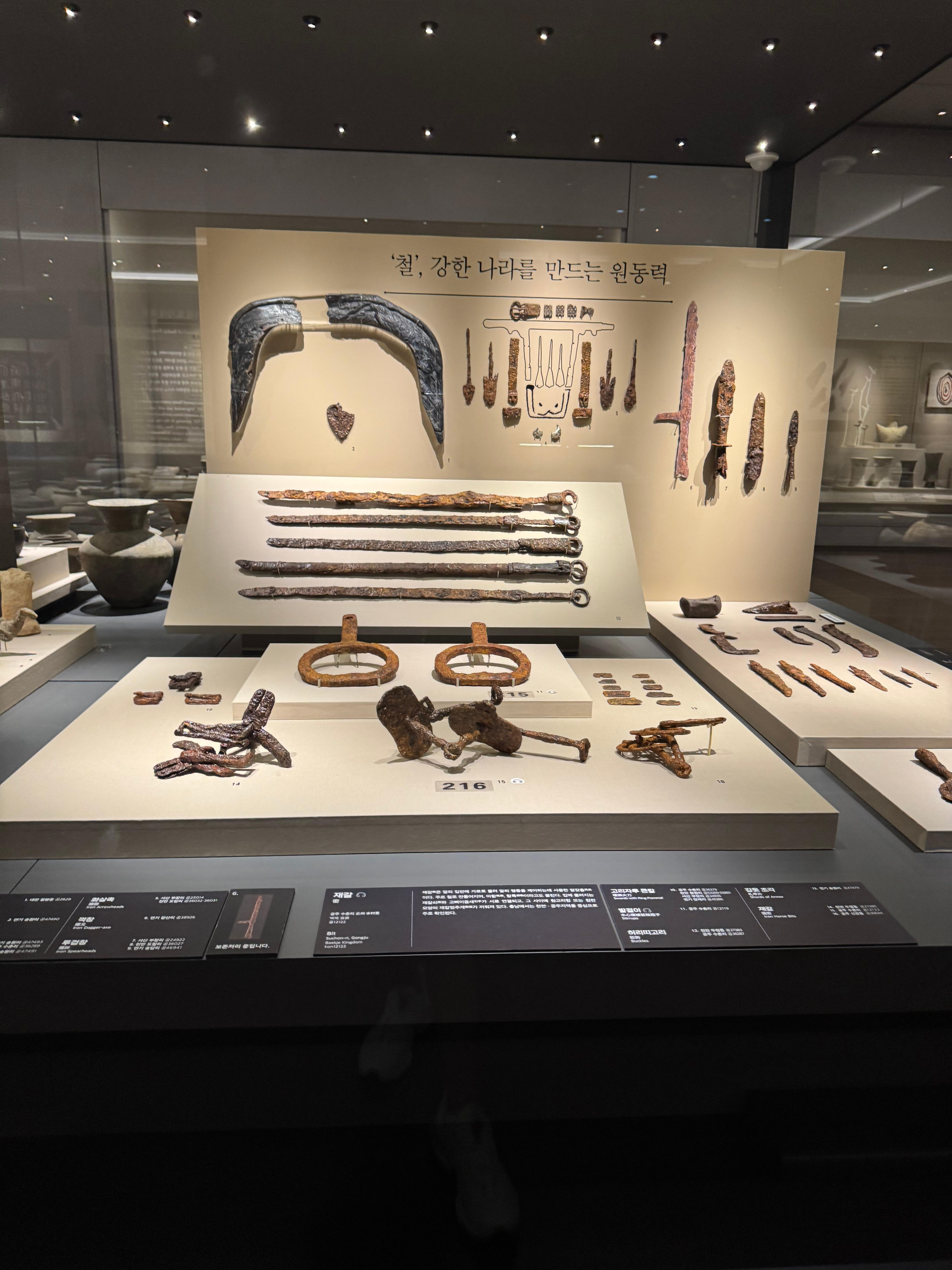 녹이 슨 긴 철제 칼들과 끝이 뾰족한 창촉, 하늘을 향해 날아갈 듯한 화살촉들이 주르륵 진열된 모습이 인상적이었어요. 어떤 칼은 손잡이 끝에 고리 모양이 달려 있고 용머리 같은 장식이 남아 있었는데, 백제의 뛰어난 공예 감각을 느낄 수 있었지요.