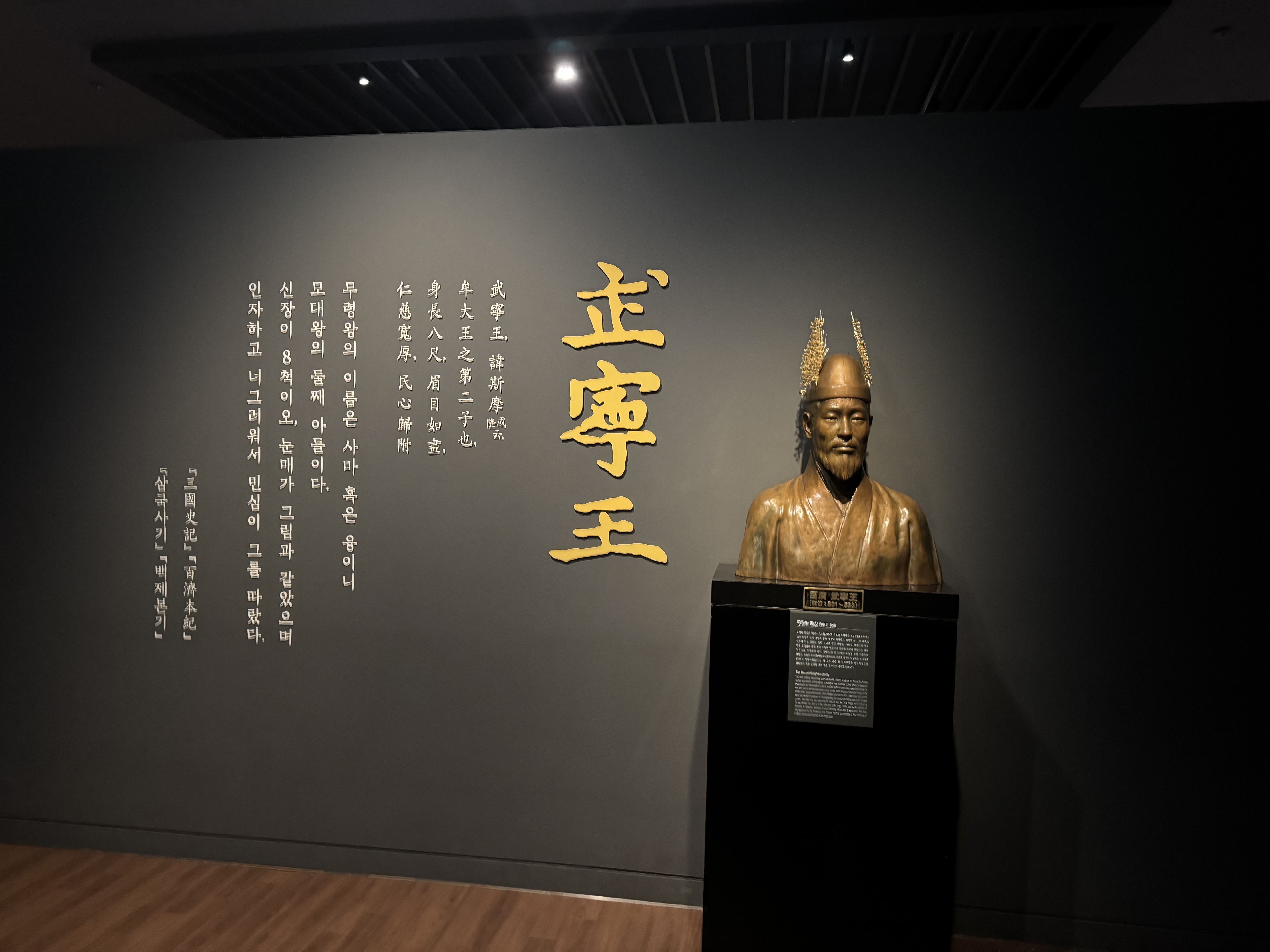전시실에 들어서자마자 만난 것은 백제 25대 무령왕의 모습을 재현한 동상이었는데요. 왕관을 쓰고 무령왕의 흉상을 보니 1500년 전 백제의 왕실이 눈앞에 살아난 듯 했어요. 이곳은 무엇보다 무령왕릉에서 출토된 유물들로 가득한 박물관의 핵심 공간이라고 합니다.