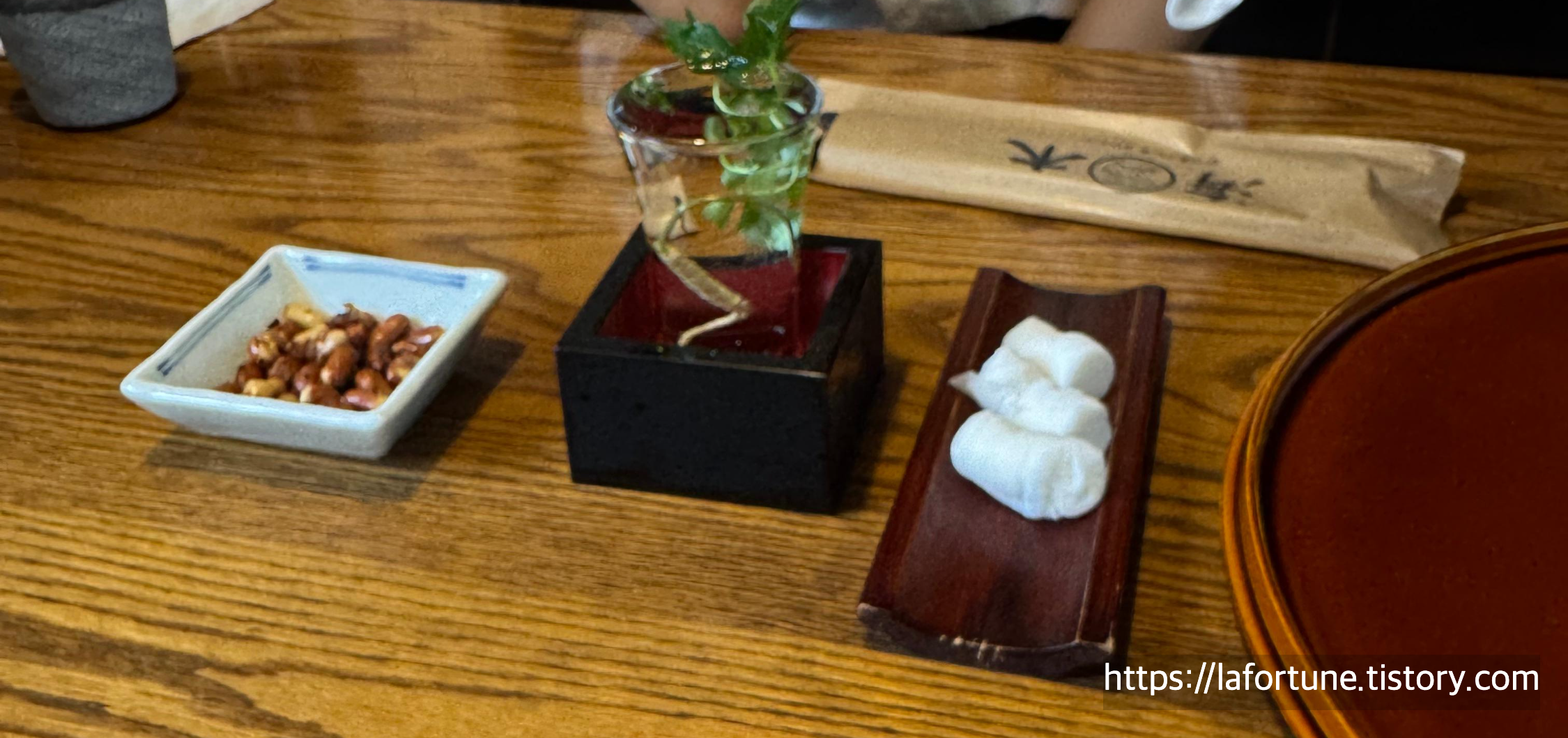 전 운전을 하느라 마시지는 못했지만 마셔본 일행 말로는 수삼이 들어간 사케는 은은한 인삼 향이 사케의 깔끔함과 절묘하게 어우러져 식전주로서 역할을 톡톡히 해주었다고 하네요. 몸이 금세 따뜻해지는 느낌과 함께 인삼의 깊은 맛이 입안 가득 퍼진다고 합니다.