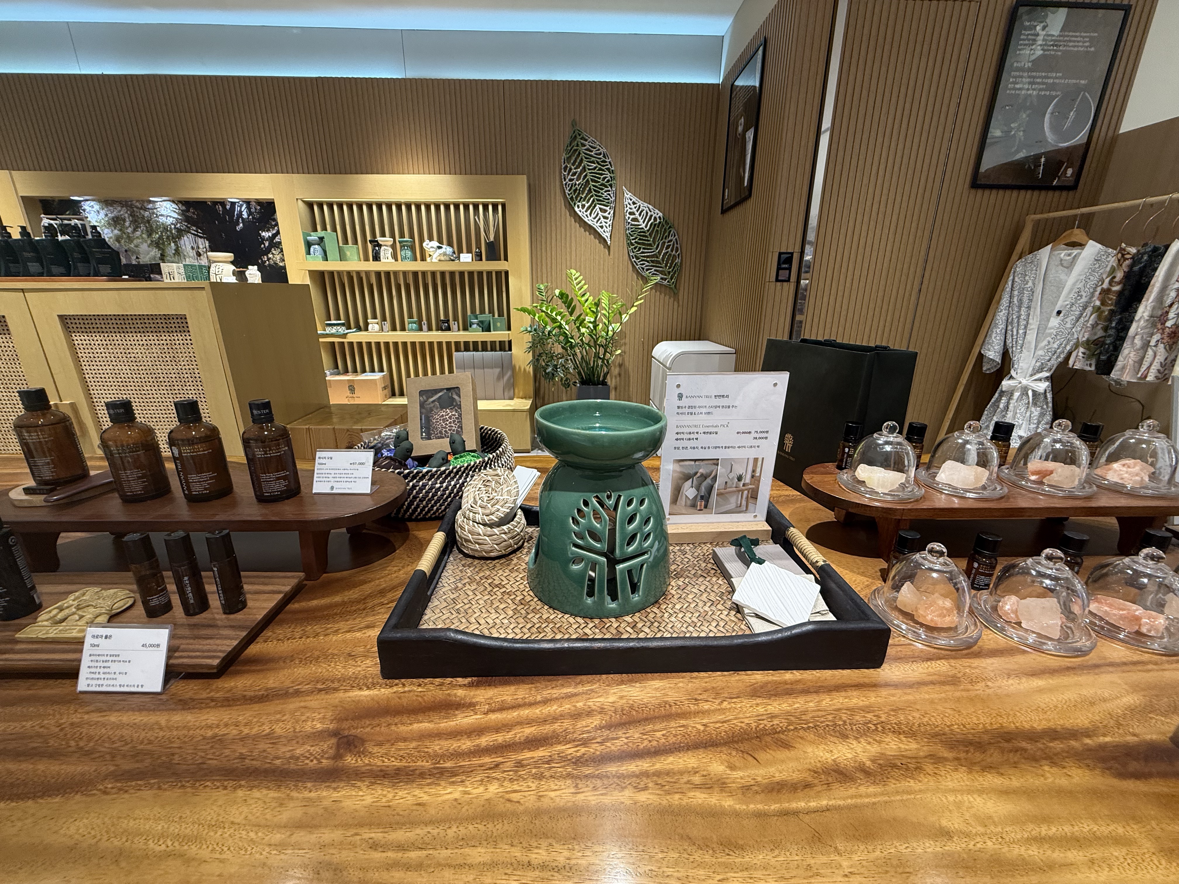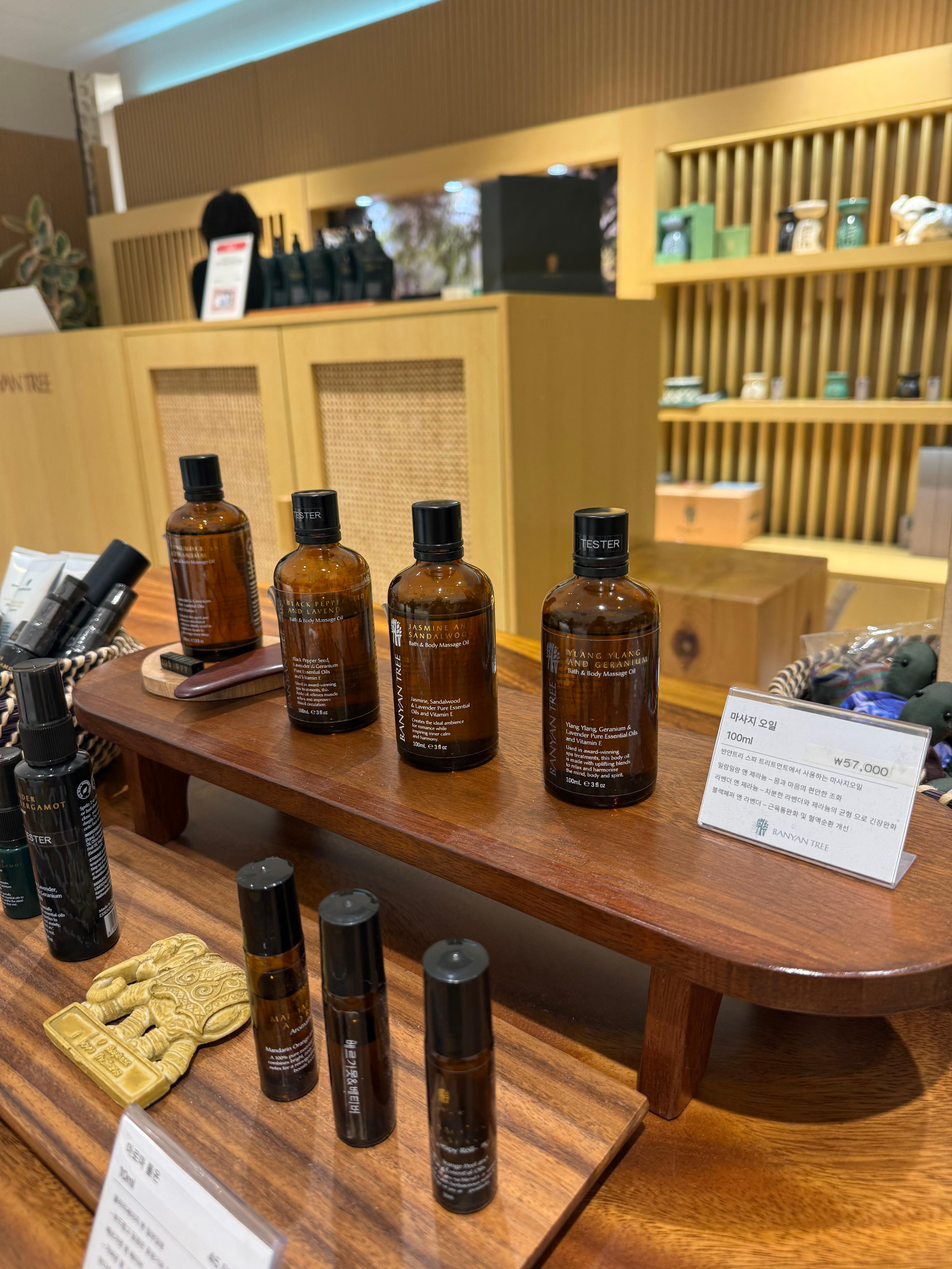 반얀트리는 태국에서 시작된 럭셔리 스파 브랜드로, 천연 재료를 사용한 아로마 제품들로 유명해요. 매장에 들어서자마자 은은한 향이 퍼지면서 힐링되는 기분이었어요.