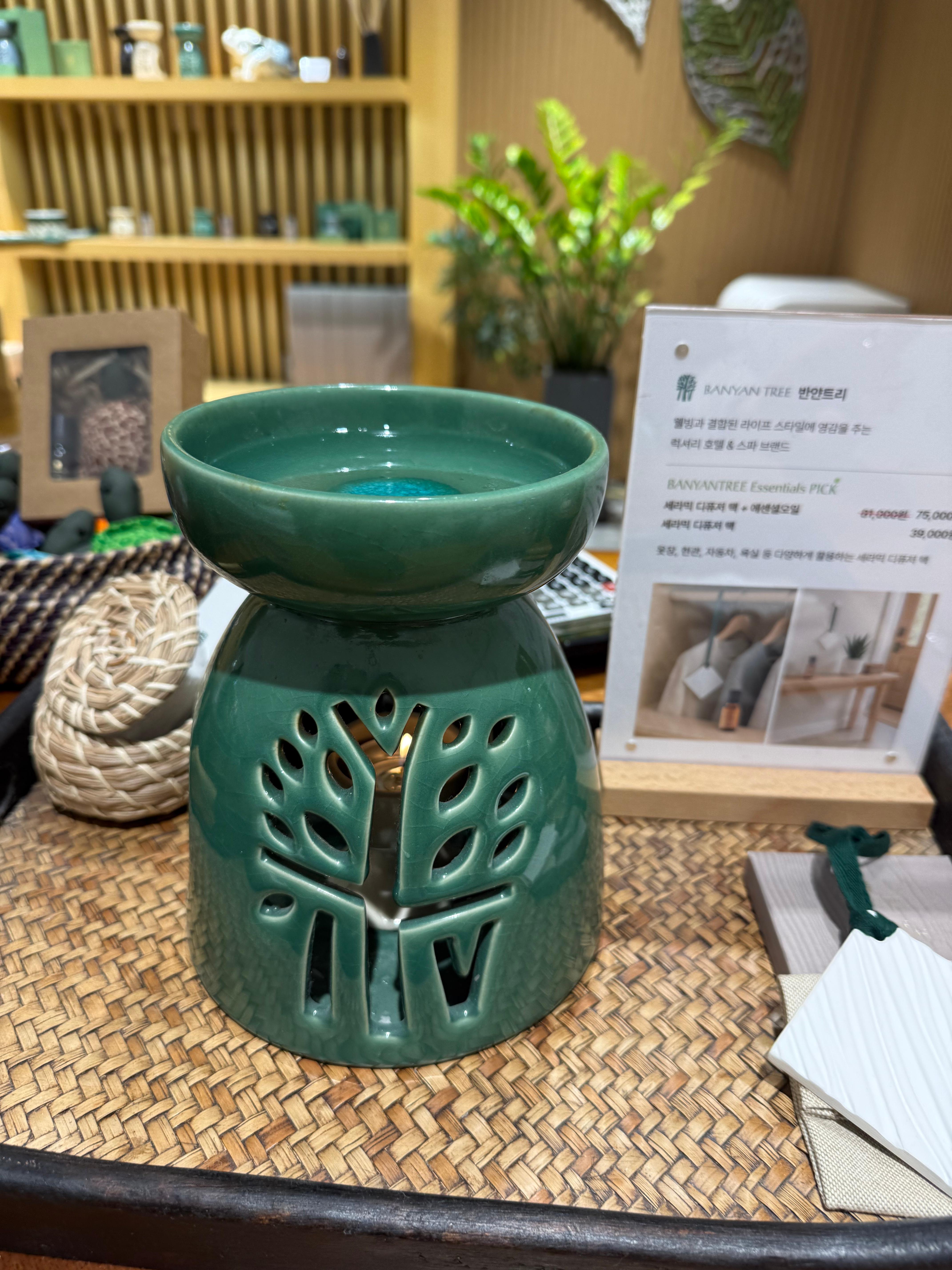 그리고 제가 눈에 띈 건 바로 이 세라믹 아로마 버너! 녹색에 나뭇잎 패턴이 새겨져 있어서 인테리어 소품으로도 딱이더라고요.