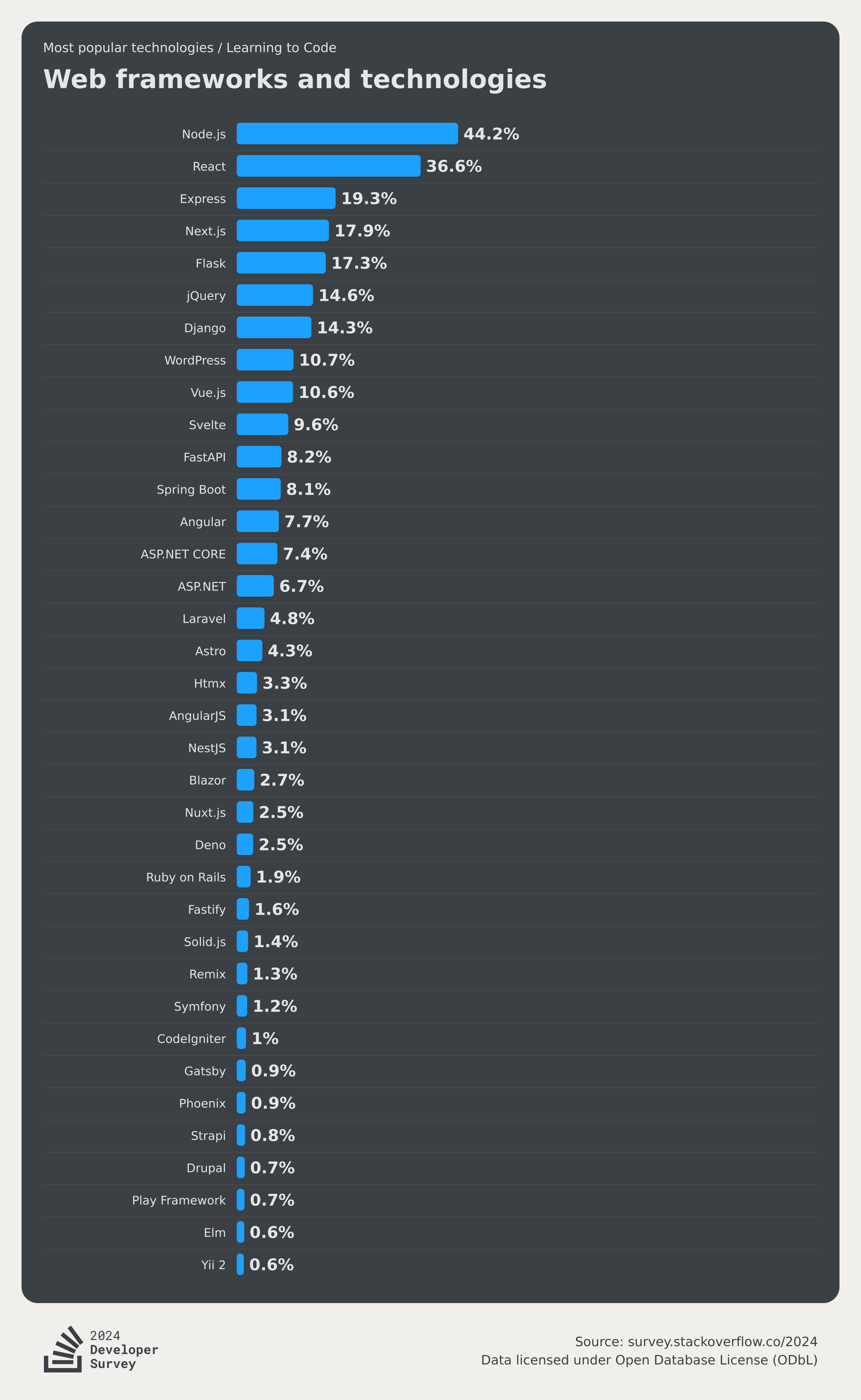매년 Stack Overflow에서 발표하는 개발자 설문조사 결과는 개발자들이 선호하는 기술 트렌드를 알아볼 수 있는 중요한 자료입니다. 이번 글에서는 코드를 배우는 사람들부터 전문가까지 각 그룹이 어떤 웹 프레임워크와 기술을 선호하는지 살펴보려고 합니다. 1. 코드를 배우는 사람들이 가장 많이 선택한 기술은?2024년, 코드를 배우는 사람들 사이에서 가장 인기 있는 기술은 바로 Node.js입니다.무려 44.2%나 되는 학습자가 이 기술을 선택했습니다. 프론트엔드에서는 React가 강세를 보이며 36.6%의 지지를 받았고요. 확실히 Node.js와 React는 배우기 쉽고, 바로바로 결과를 볼 수 있는 기술이라 초보자들에게 인기 있는 것 같아요. 코딩을 처음 시작할 때는 빠르게 눈에 보이는 성과를 내는..